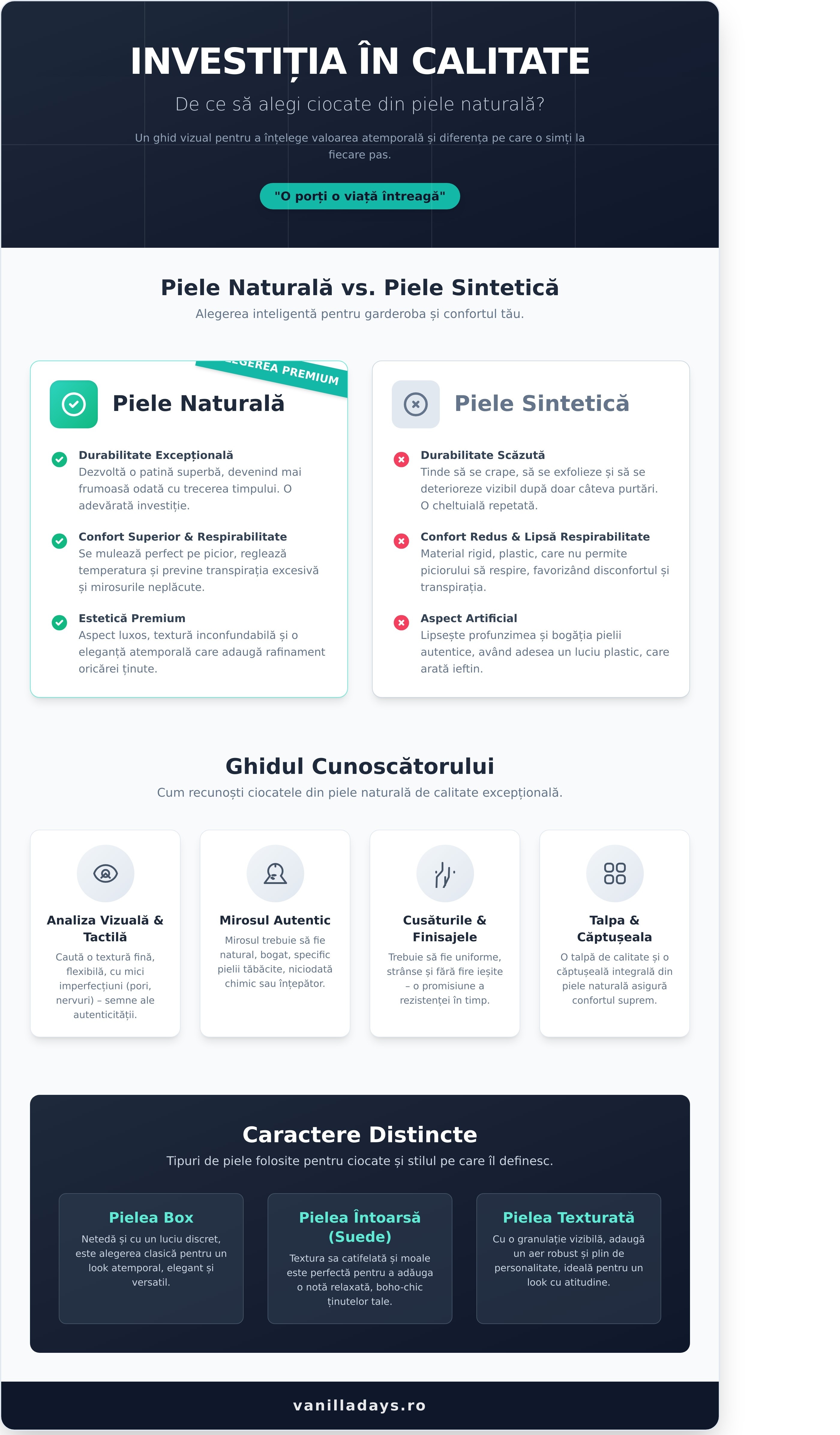 Eticheta "piele naturală" este doar începutul poveștii. Nu toate pieile sunt create la fel, iar diferența dintre o pereche de ciocate mediocre și una excepțională stă în detalii. A învăța să le recunoști te transformă dintr-un simplu cumpărător într-un cunoscător exigent. La Vanilla Days, credem în transparență totală, pentru că măiestria noastră se vede și se simte în fiecare produs. Iată ghidul tău practic pentru a alege calitatea absolută.