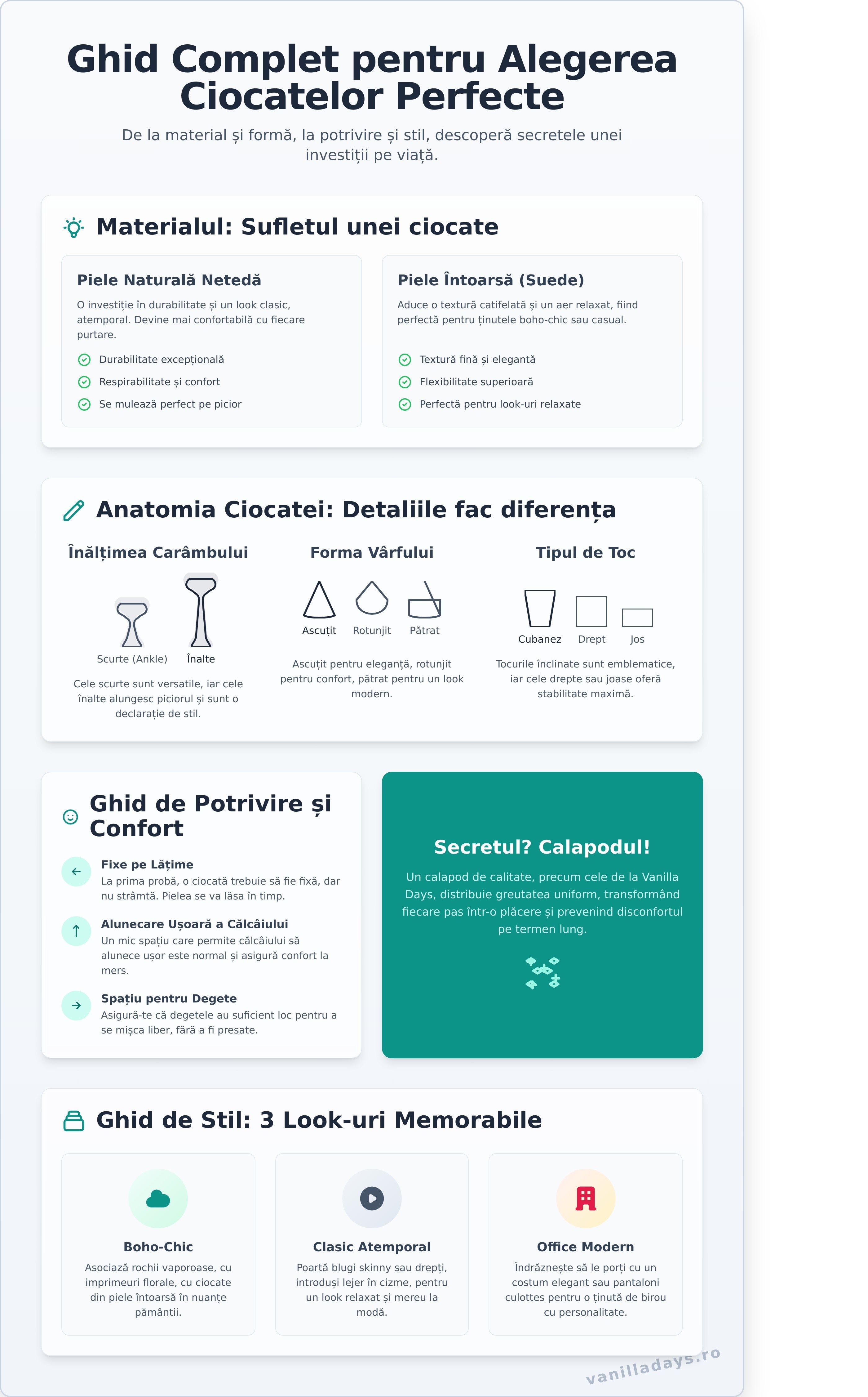Prin respectarea acestor pași simpli, te vei asigura că perechea ta preferată de ciocate își păstrează farmecul și calitatea sezon după sezon. O îngrijire meticuloasă transformă o simplă pereche de încălțăminte într-un companion de încredere pentru nenumărate aventuri stilate. Explorează colecția Vanilla Days și alege modelul pe care îl vei prețui o viață.
