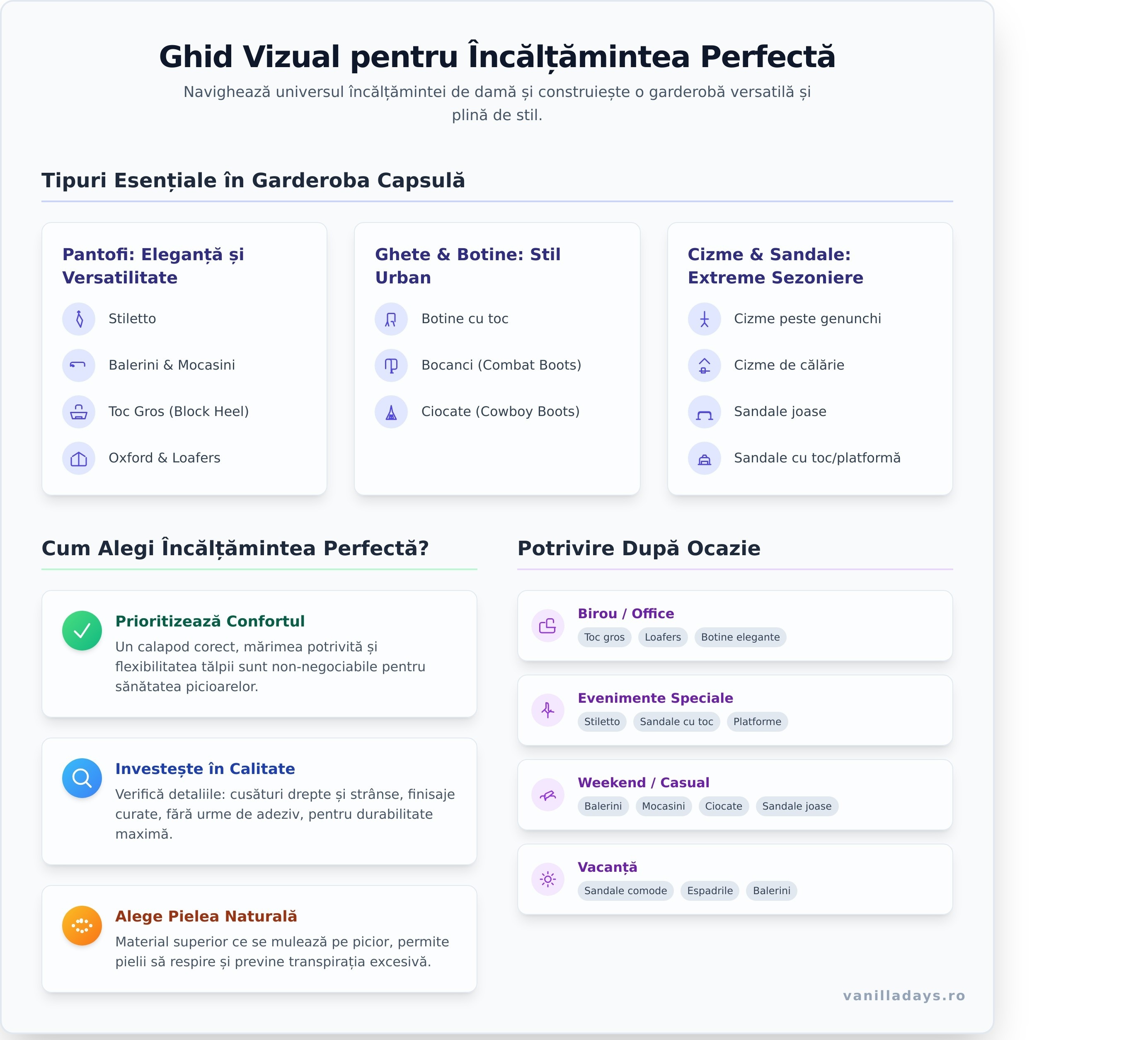 Acest ghid este creat pentru a te ajuta să navighezi universul fascinant al încălțămintei de damă. Descoperă cum să alegi și să asortezi încălțămintea perfectă, de la pantofi eleganți la ciocate de atitudine, pentru a construi o garderobă versatilă și plină de stil, care să te reprezinte în fiecare moment.