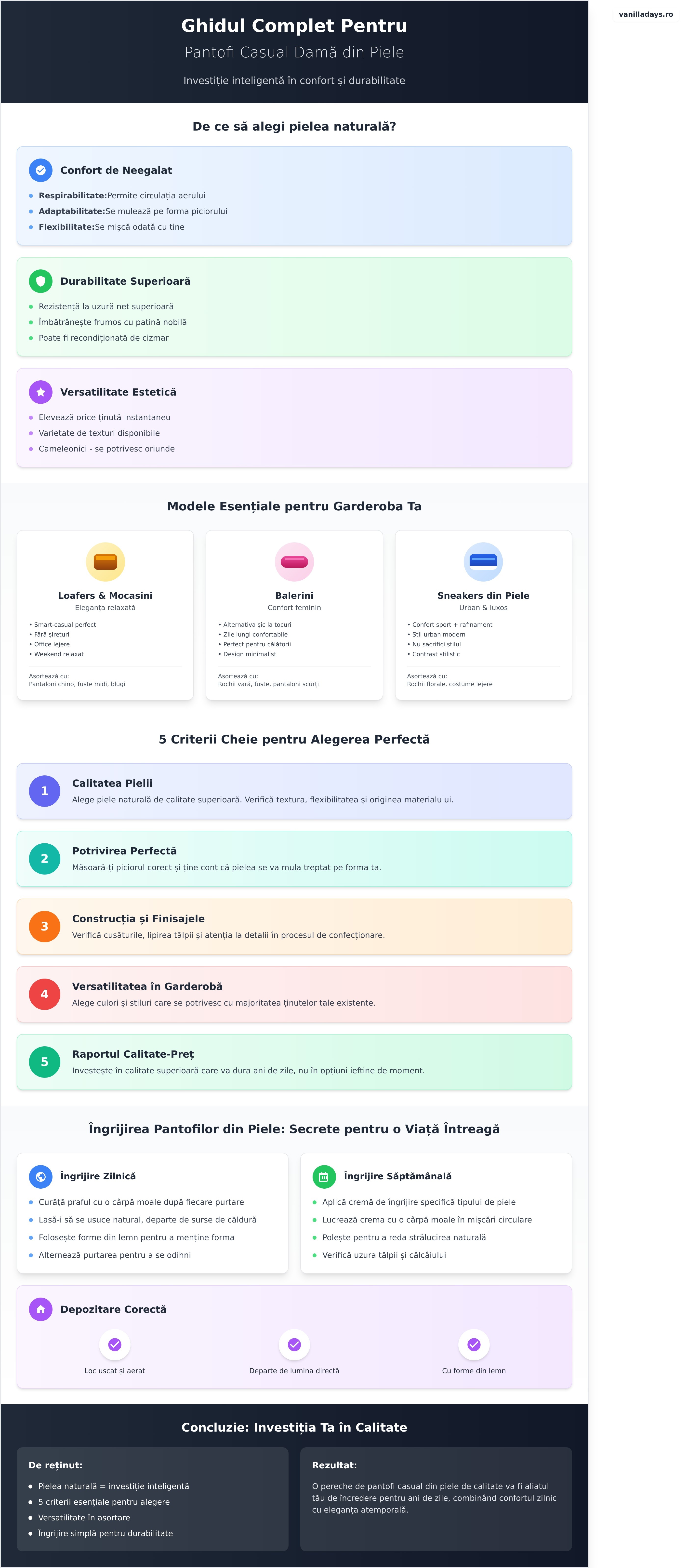 Lumea pantofilor casual din piele pentru damă este un univers al posibilităților, unde confortul premium se întâlnește cu designul atemporal. De la eleganța relaxată a unor loafers la atitudinea urbană a sneakerșilor, există o pereche perfectă pentru fiecare stil și fiecare moment. Calitatea pielii este, desigur, esențială. Pentru a face o alegere informată și a înțelege ce înseamnă cu adevărat o investiție de durată, este util să cunoști diferitele tipuri de materiale și chiar să consulți surse oficiale care definesc standardele pentru piele. Haide să explorăm împreună cele mai versatile și îndrăgite modele.