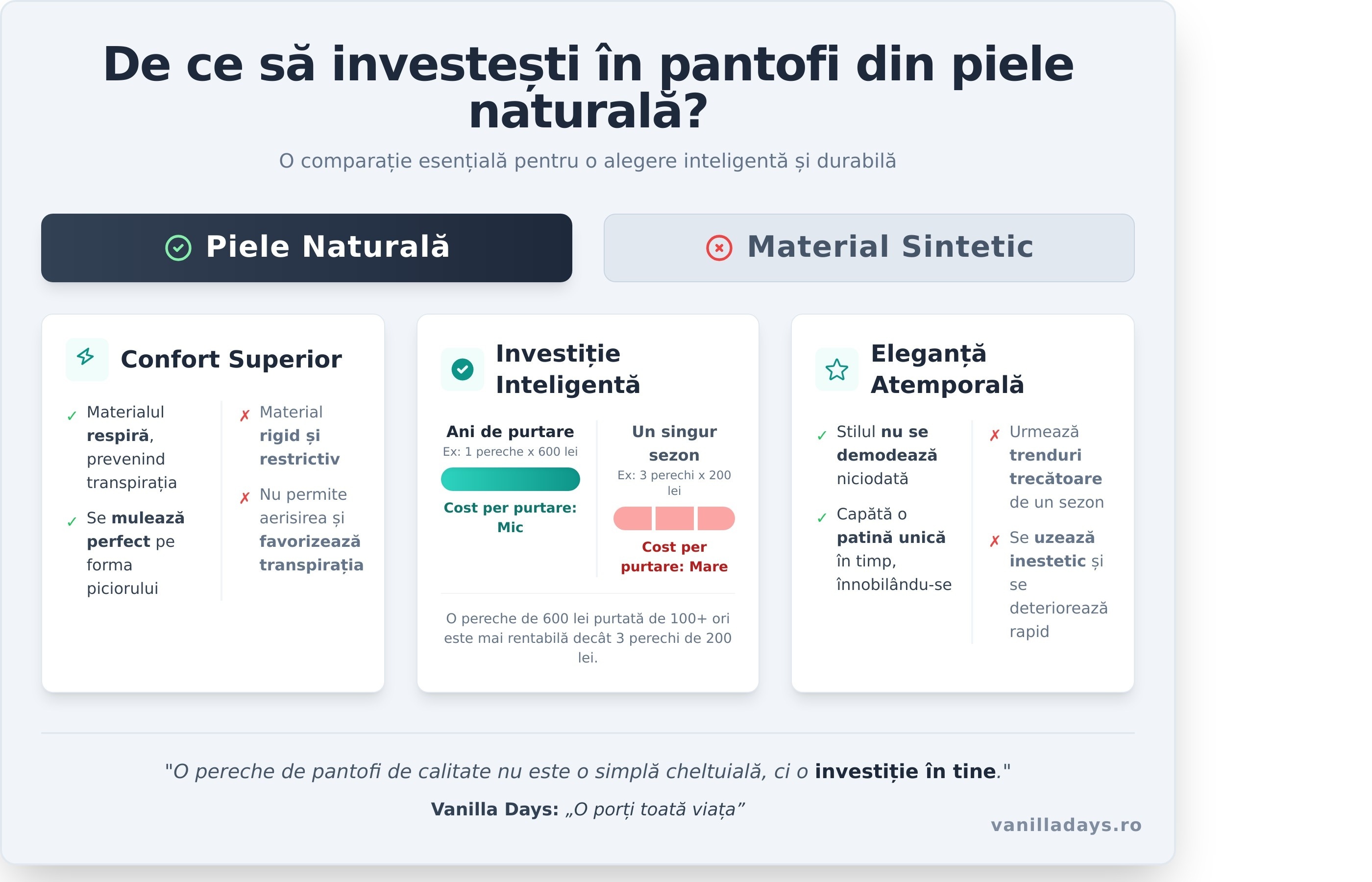 Într-o lume dominată de trenduri trecătoare, alegerea unei perechi de pantofi dama piele naturala este o declarație. Nu este doar despre modă, ci despre o filozofie de viață – una care prețuiește calitatea, durabilitatea și rafinamentul. Spre deosebire de articolele 'fast fashion', create să reziste un singur sezon, încălțămintea din piele este o investiție conștientă. Este promisiunea unui confort superior și a unui stil care transcende timpul, aliniată perfect cu viziunea Vanilla Days: „O porți toată viața”.