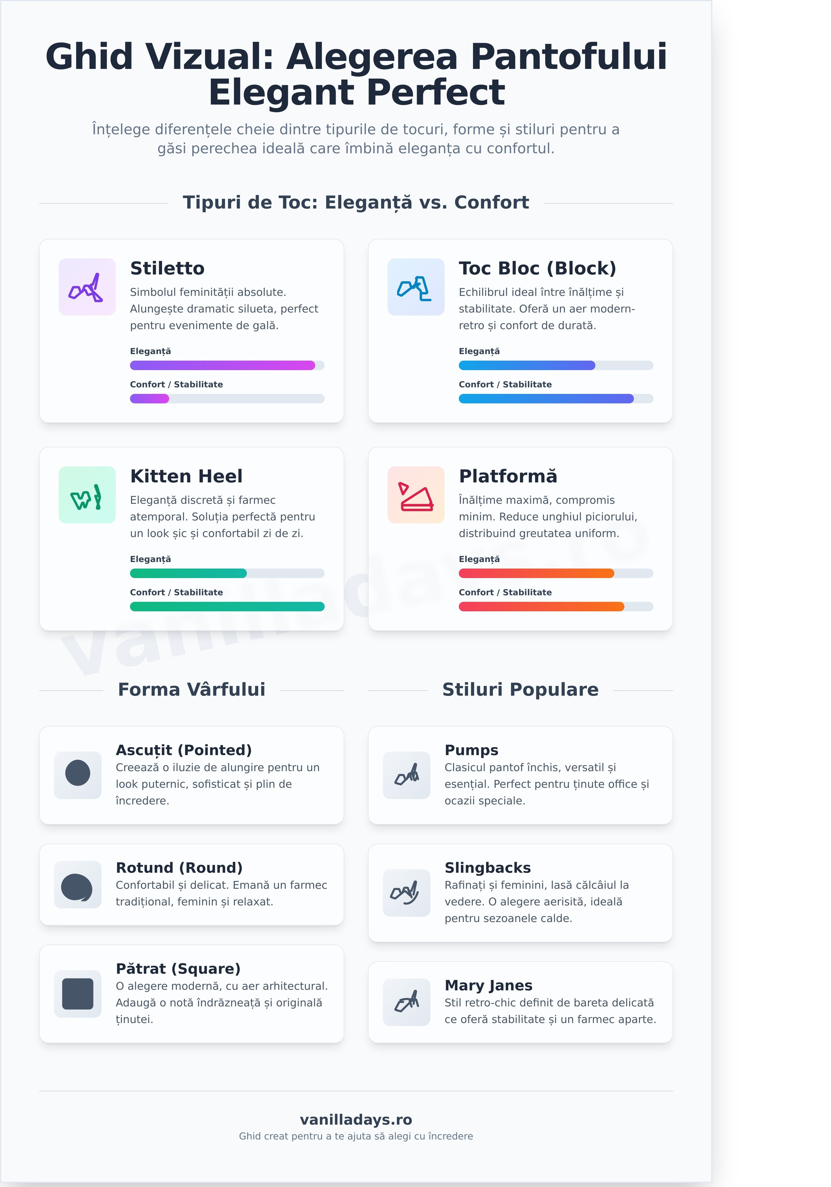 Înălțimea și forma tocului definesc atitudinea unui pantof. Fiecare tip oferă avantaje distincte, de la eleganța dramatică la confortul absolut.