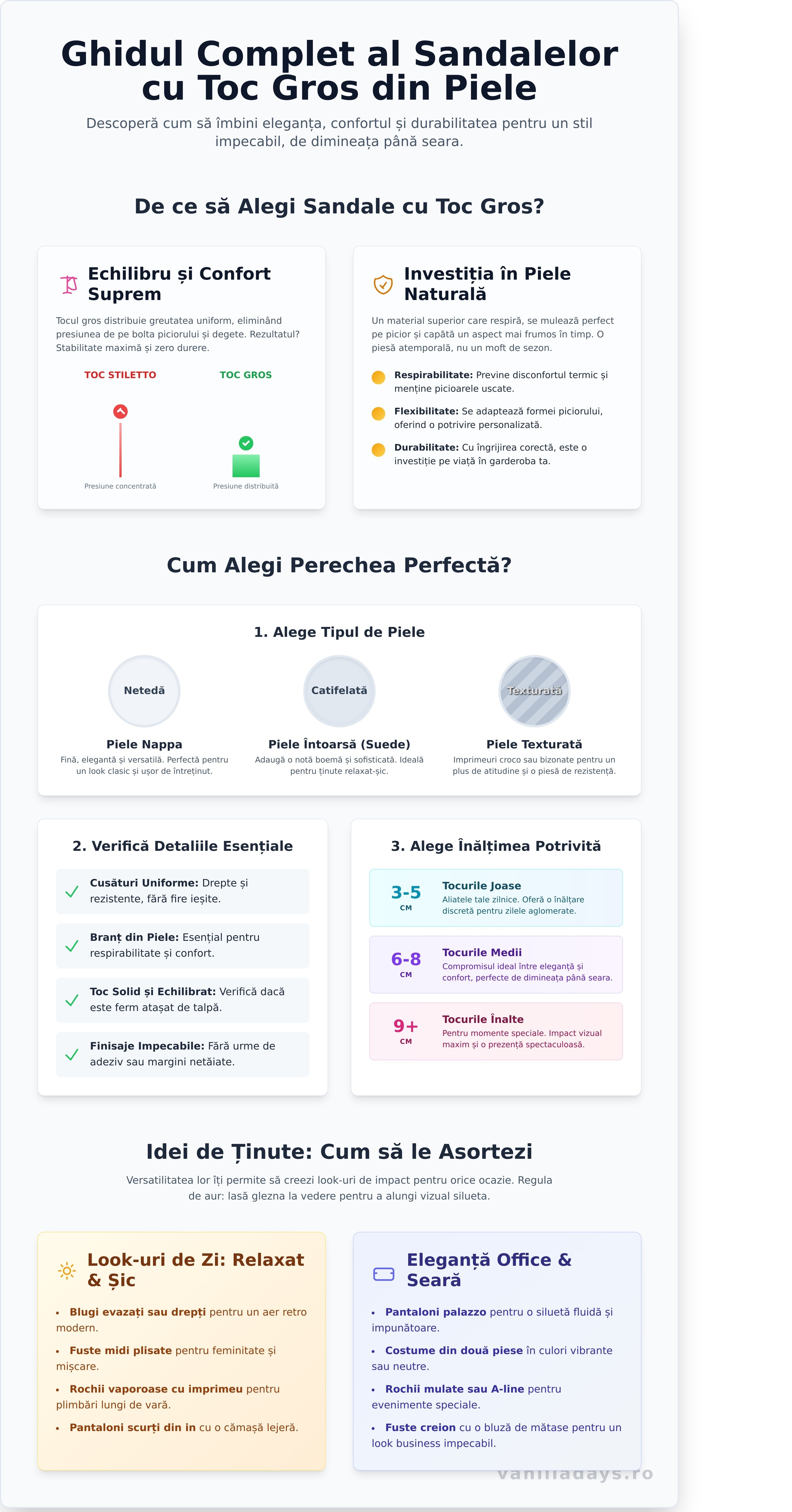 Parcurgând acest ghid, ai descoperit că nu trebuie să alegi între stil și stare de bine. Sandalele cu toc gros din piele naturală sunt dovada că rafinamentul poate fi perfect stabil și confortabil, adaptându-se oricărei ținute, de la cele de zi, relaxate, până la cele de seară, sofisticate. Ai învățat cum să recunoști calitatea autentică și cum să îți îngrijești investiția pentru a te bucura de ea ani la rând.
