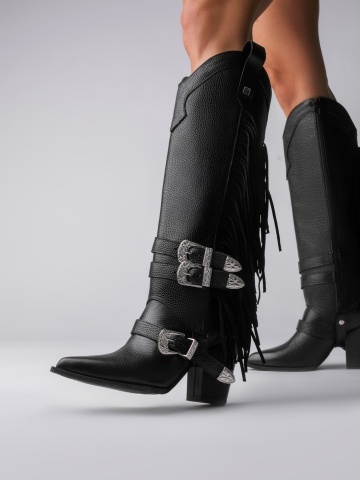 Descopera ciocatile Ruby toc inalt, confectionate din piele bizonata neagra, cu accesorii argintii si un manson elegant cu franjuri. Cu un toc de 8 cm, aceste ciocate nu doar ca ofera confort, dar adauga si un strop de stil oricarei tinute. Materialul exterior si interior din piele naturala asigura durabilitate si respirabilitate. Perfecte pentru orice ocazie, aceste ciocate sunt alegerea ideala pentru a-ti evidenția personalitatea. Comanda acum si transforma-ti garderoba!