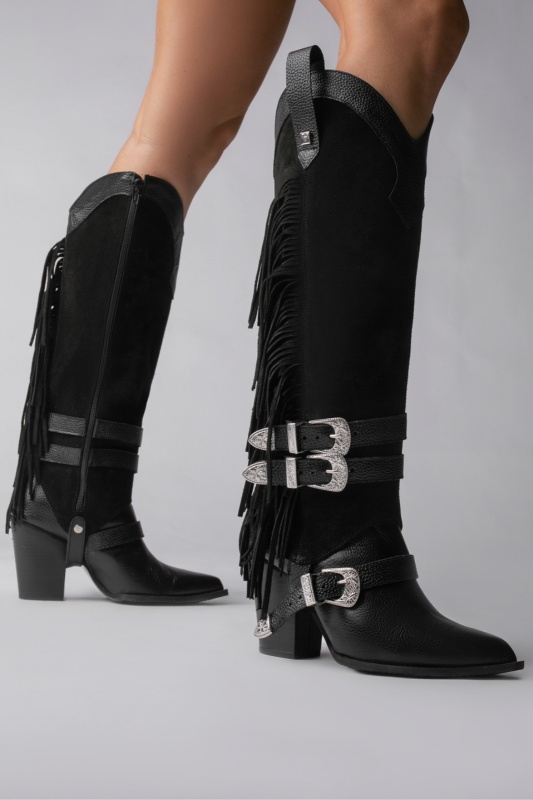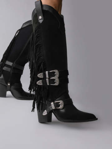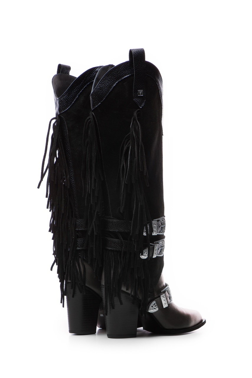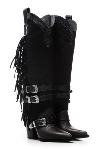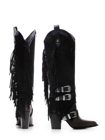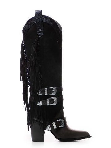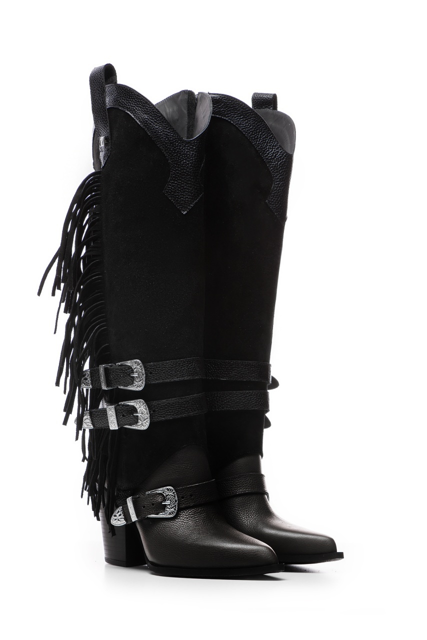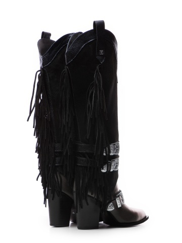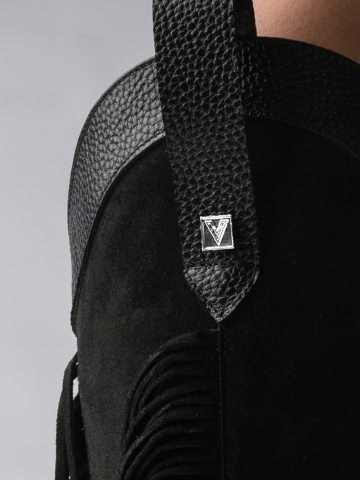 Ciocate Ruby toc inalt, piele bizonata neagra cu accesorii argintii si manson piele intoarsa cu franjuri