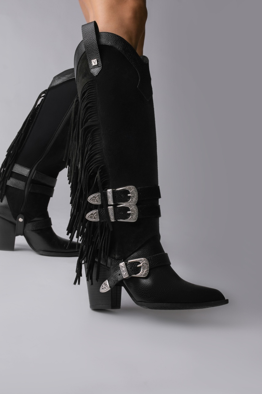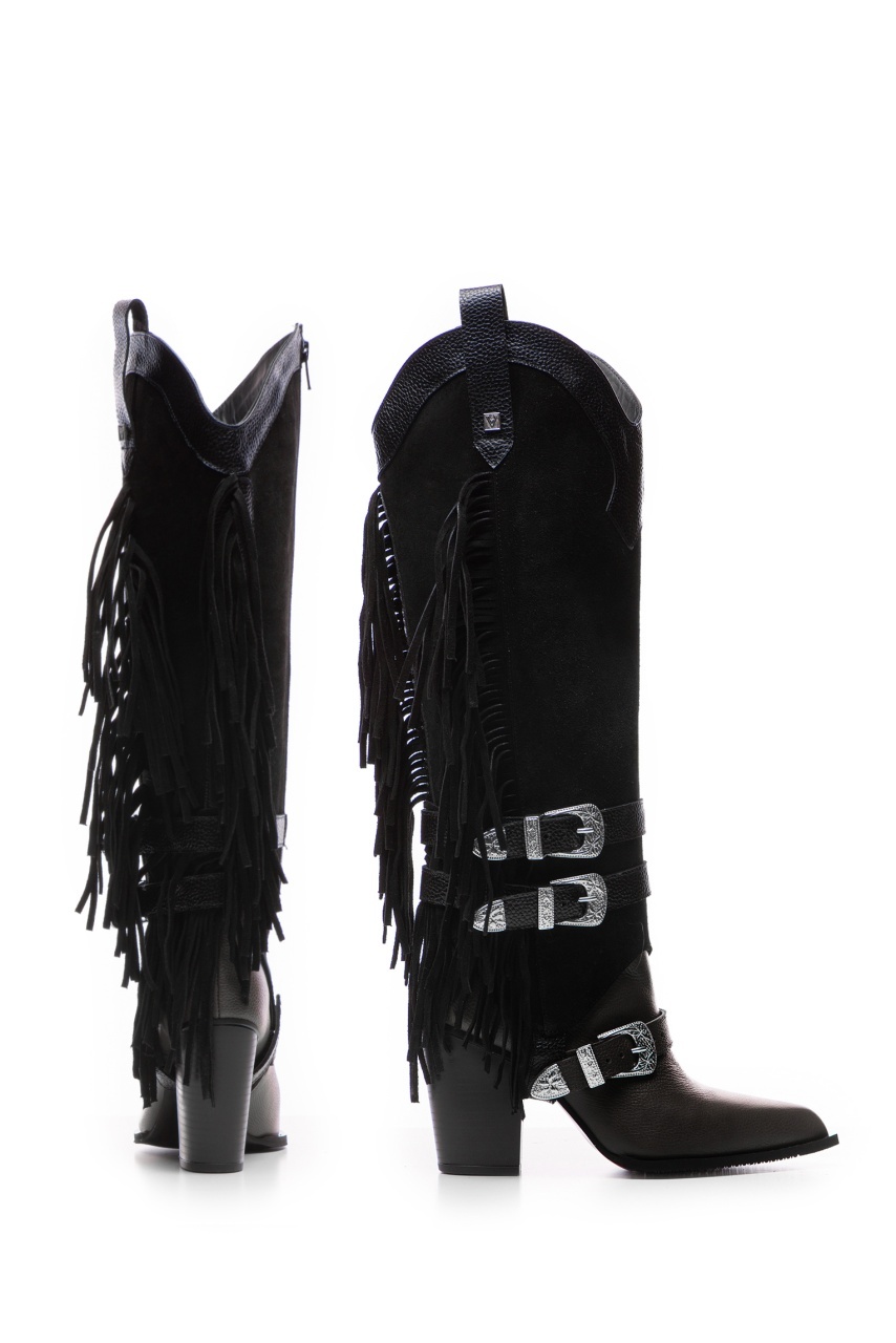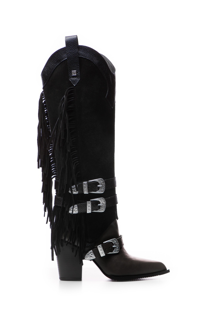 Ciocate Ruby toc inalt, piele bizonata neagra cu accesorii argintii si manson piele intoarsa cu franjuri