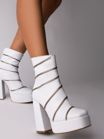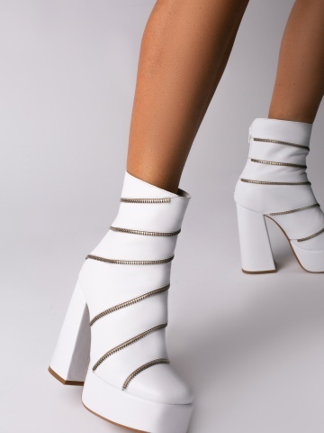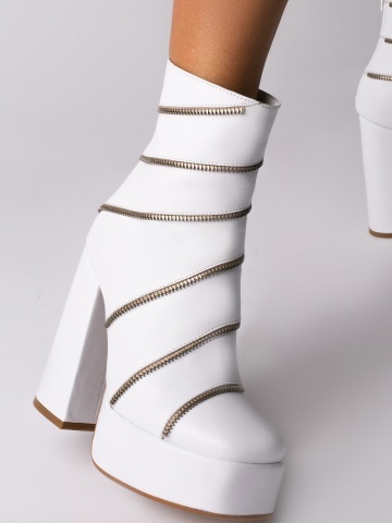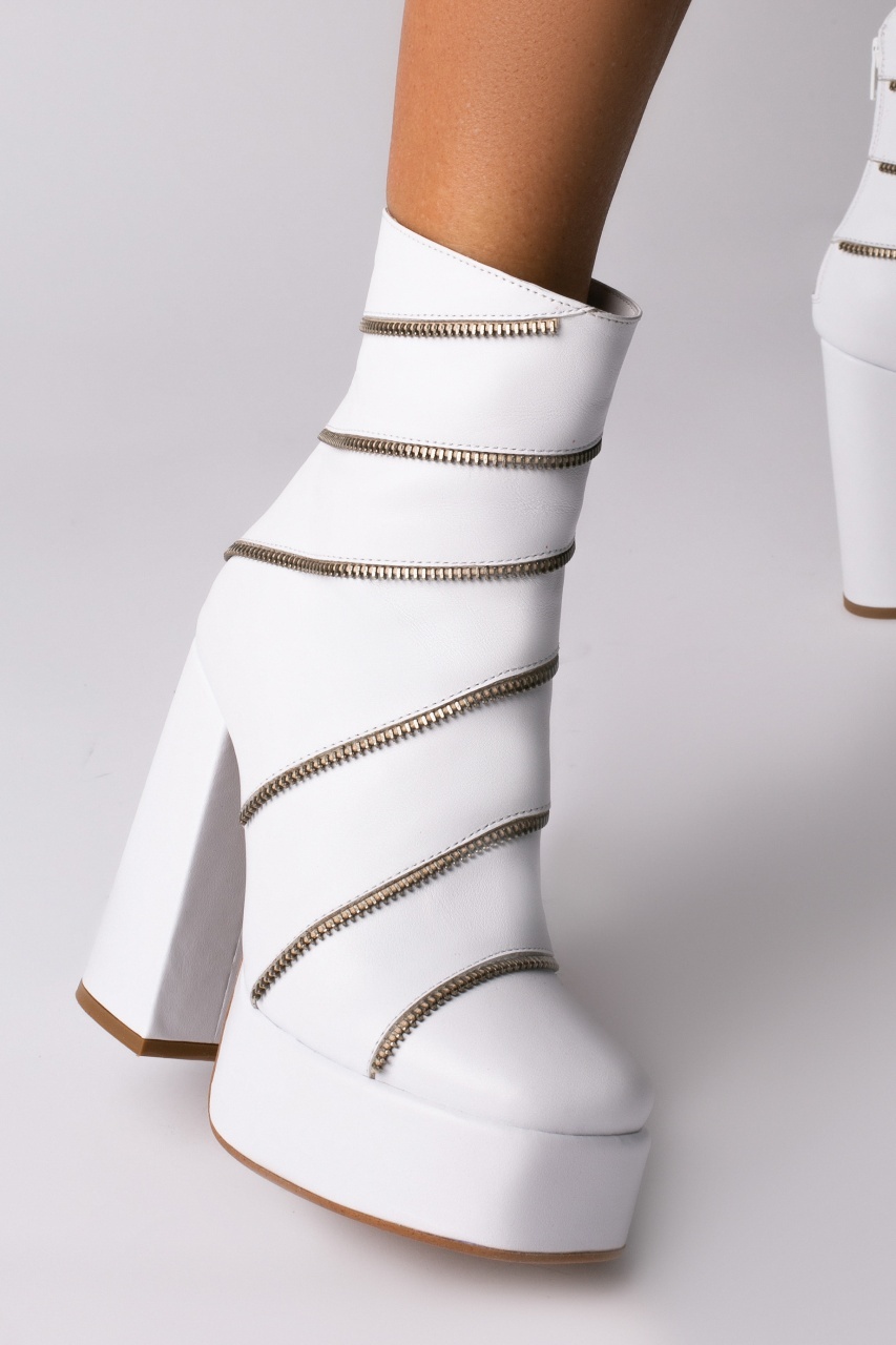 Ghete Sagaza piele naturala alba cu toc gros si accesorii tip fermoar argintiu