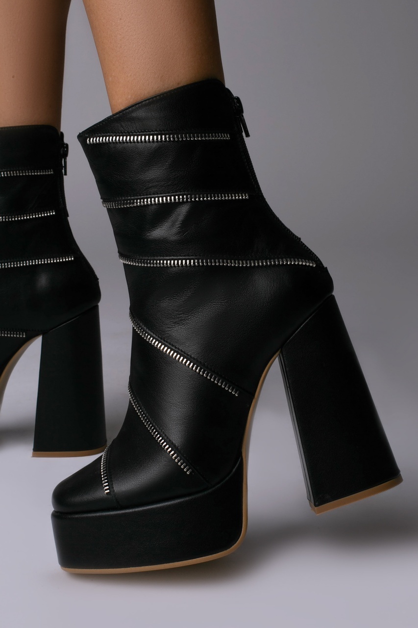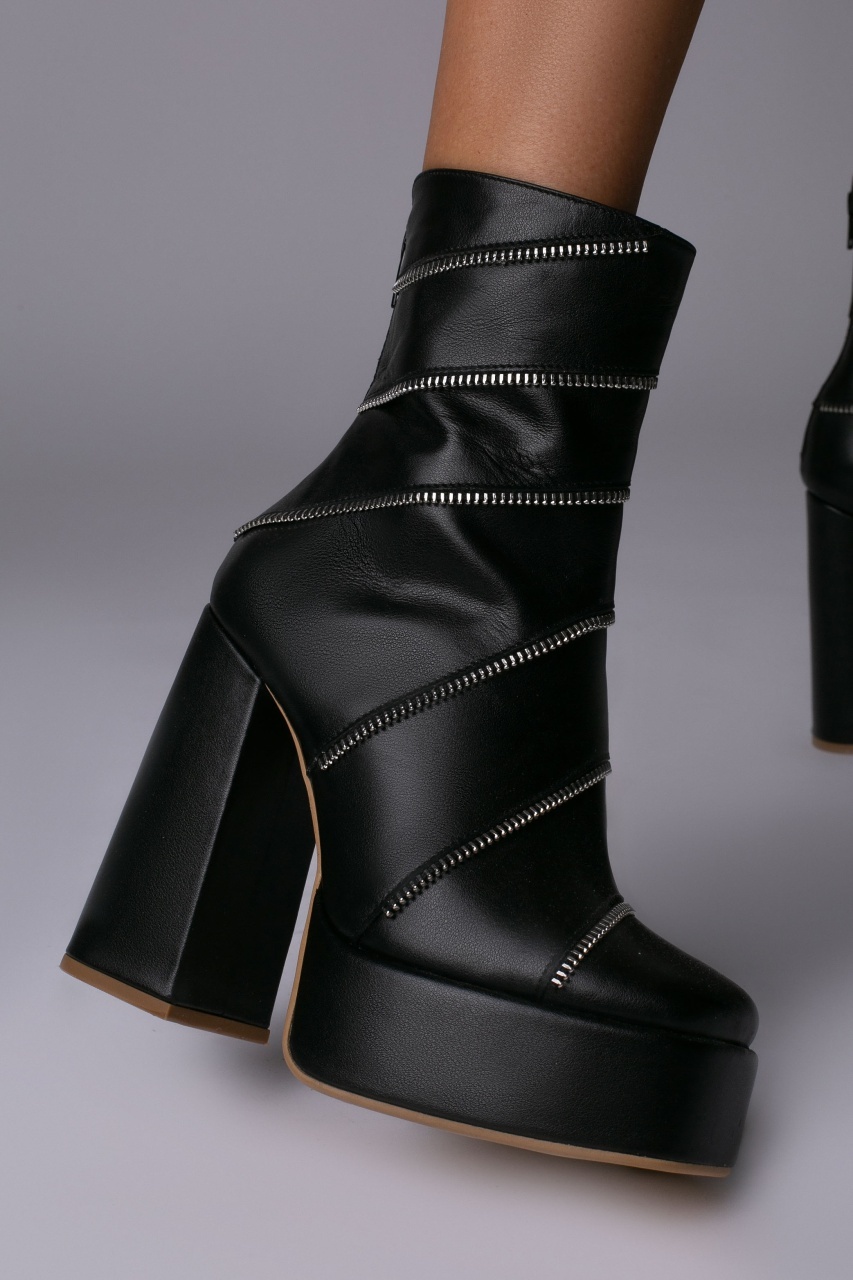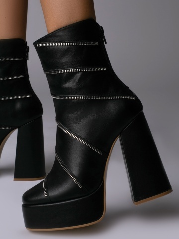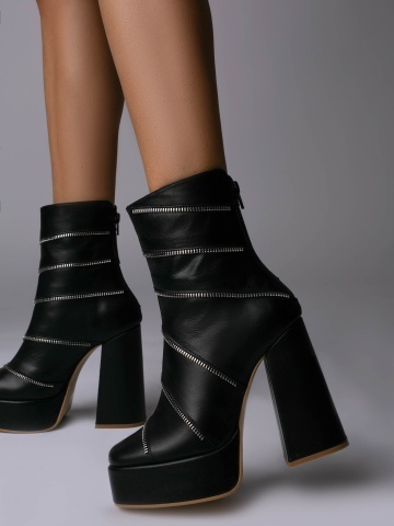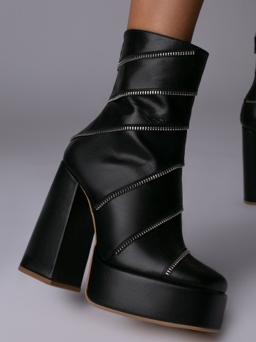 Ghete Sagaza piele naturala neagra cu toc gros si accesorii tip fermoar argintiu