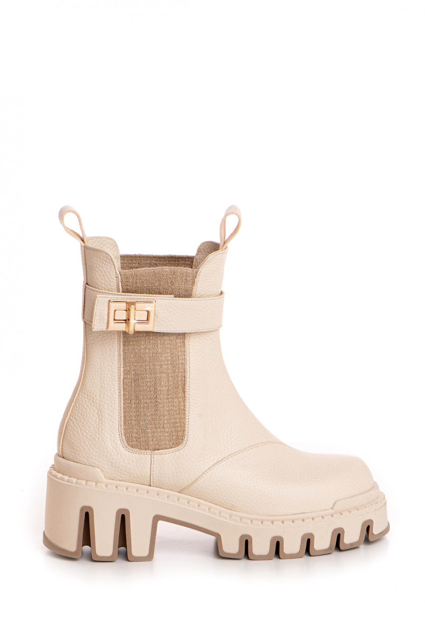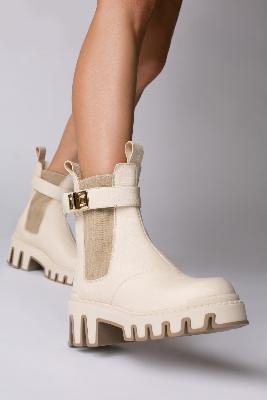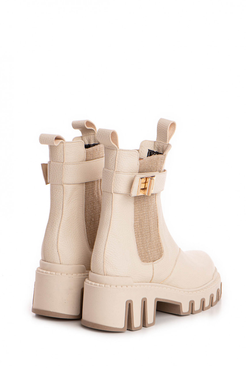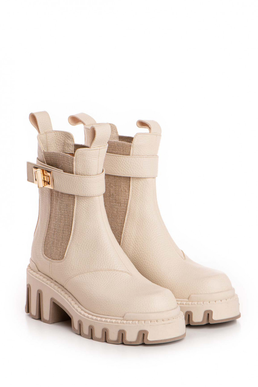 Ghete crem din piele naturală, finisate impecabil și detalii aurii, pentru un stil rafinat și modern.