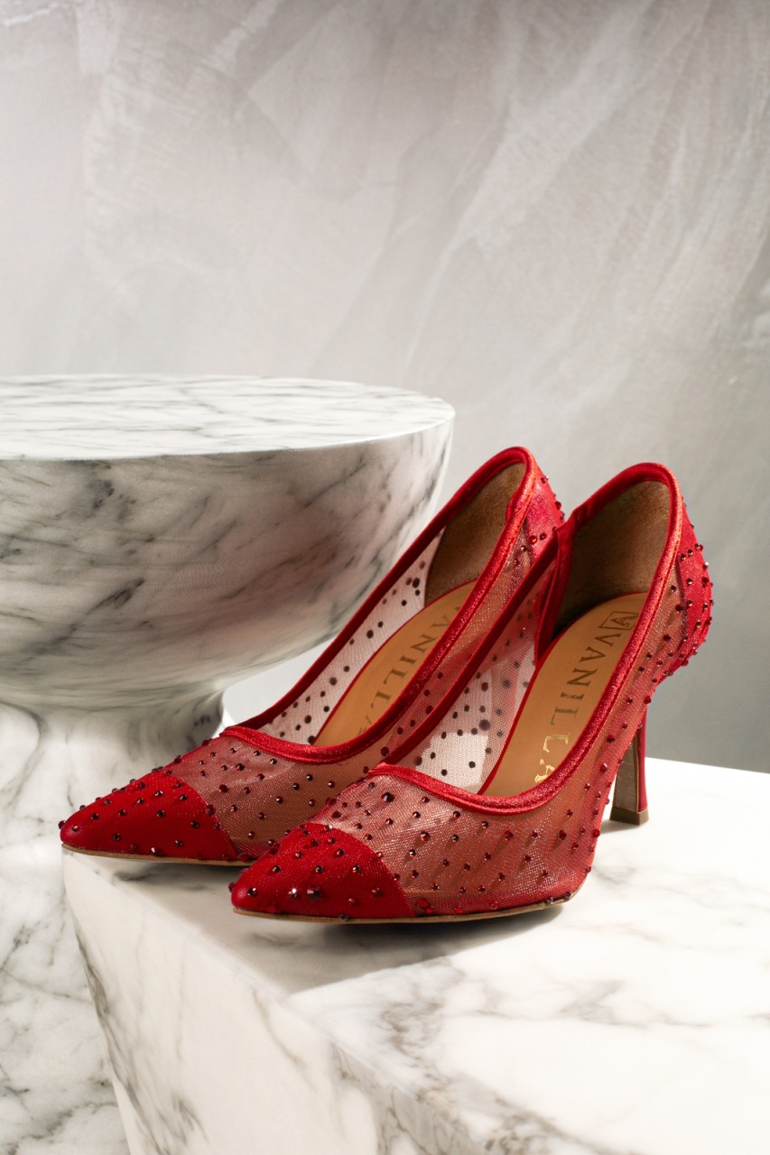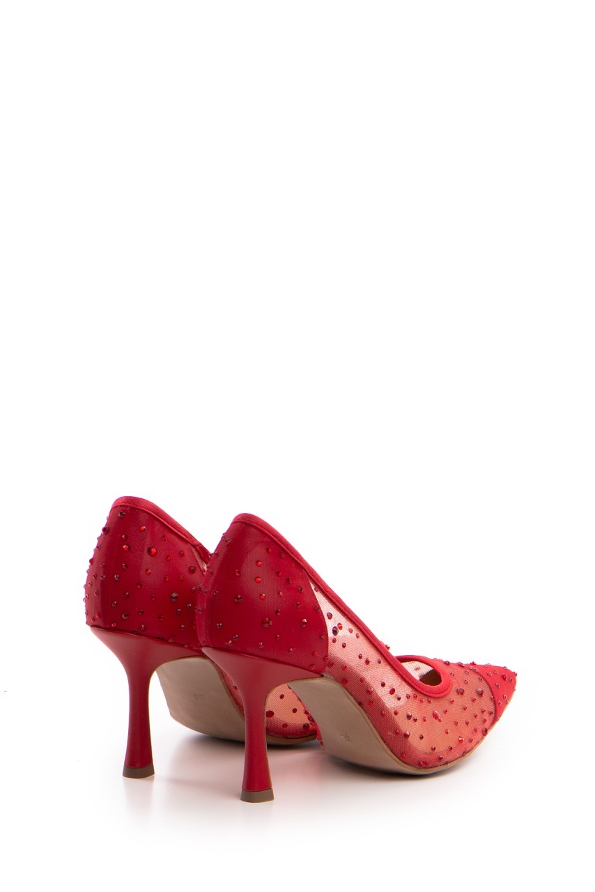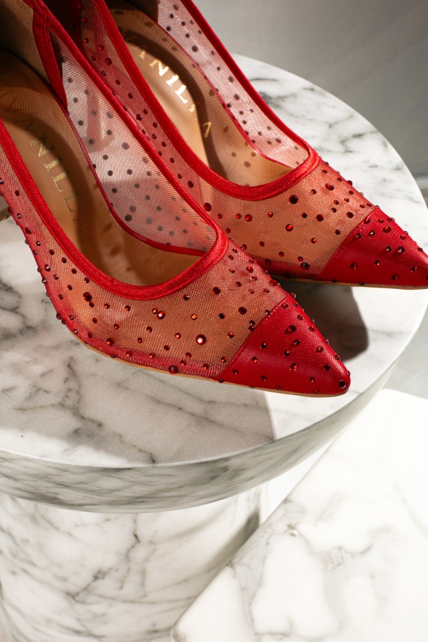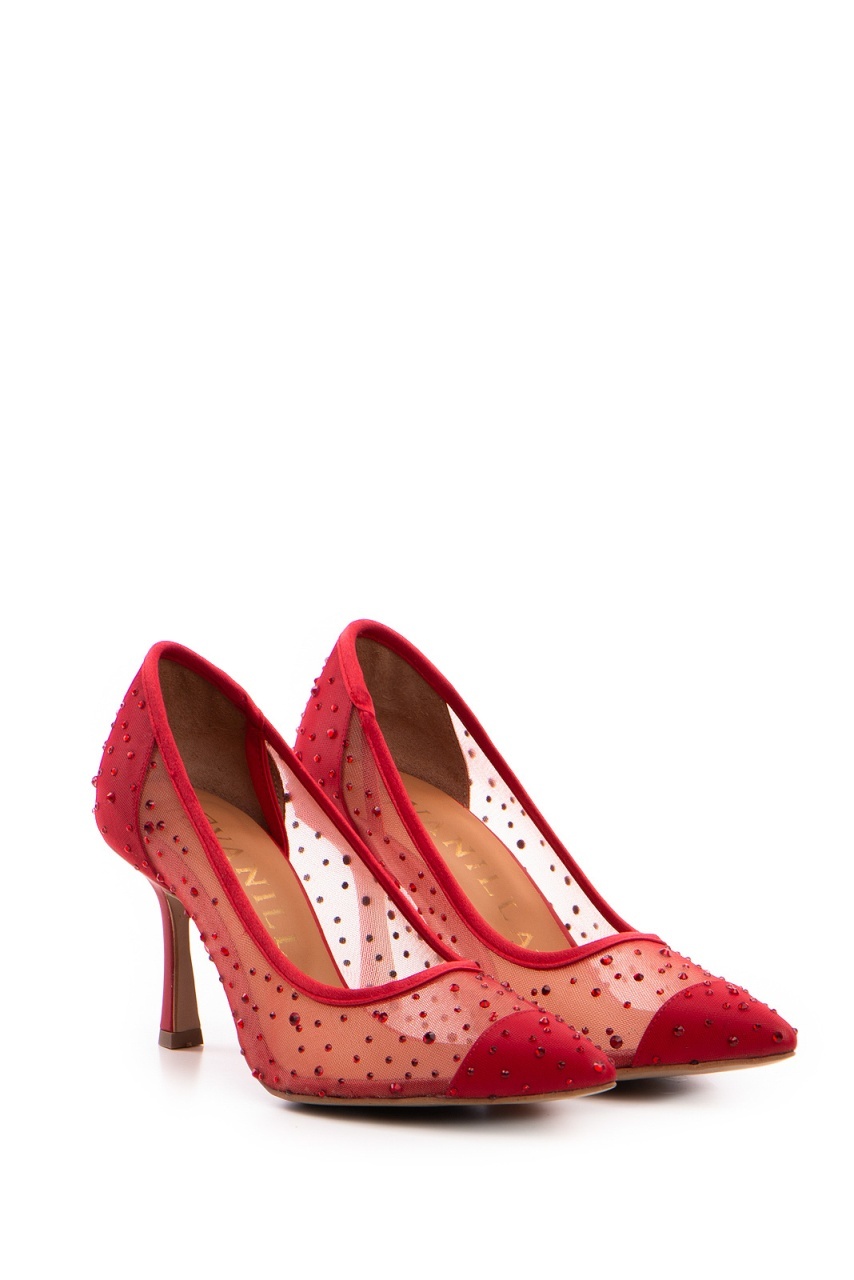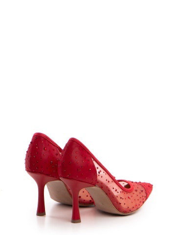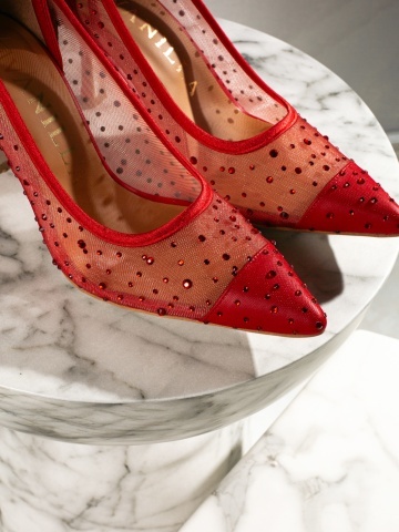 Pantofi Evelisse piele naturala rosie cu toc mic evazat si cristale