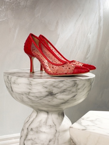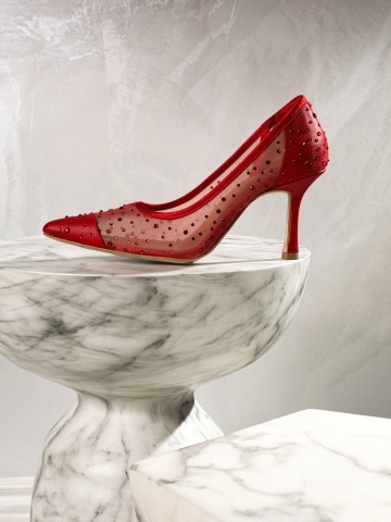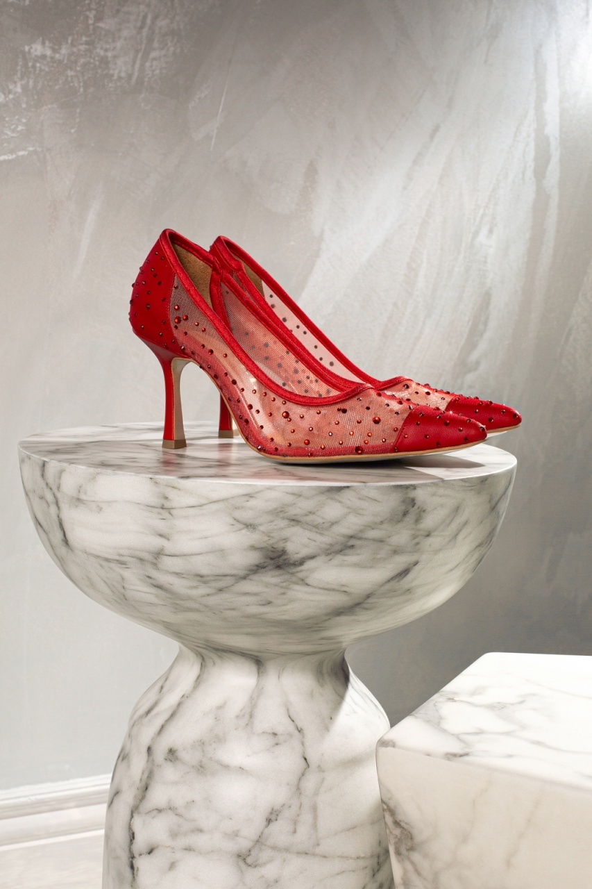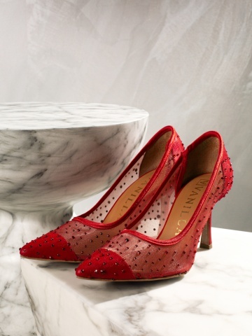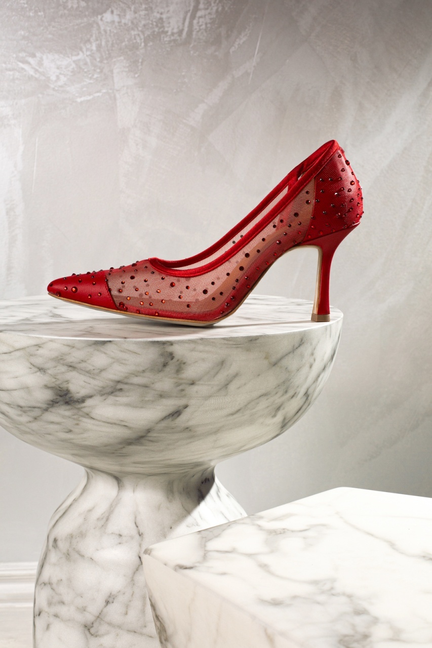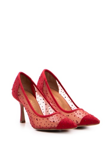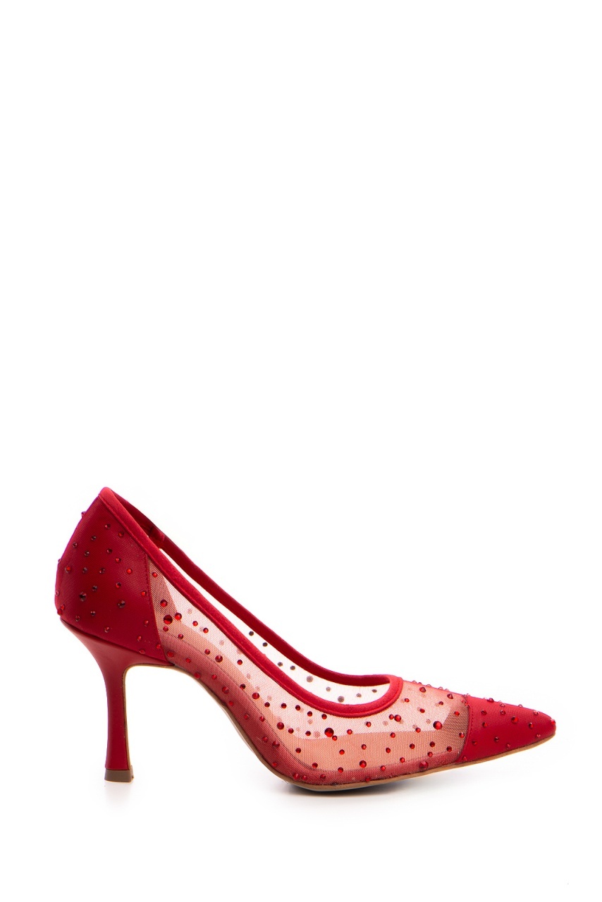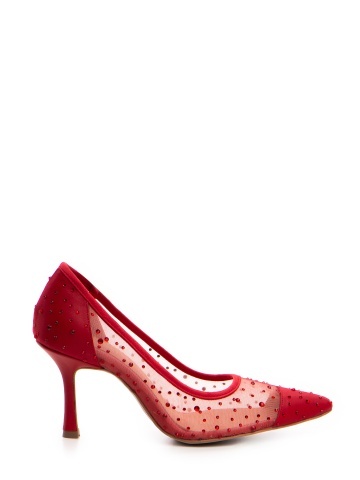 Pantofi Evelisse piele naturala rosie cu toc mic evazat si cristale
