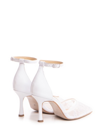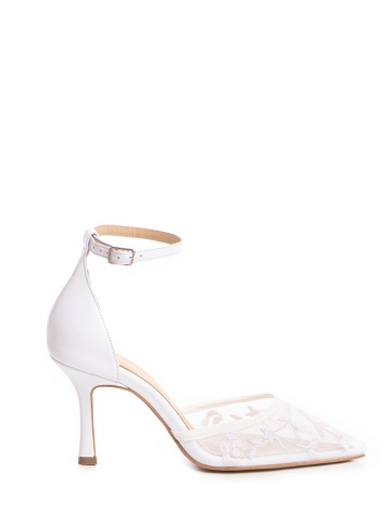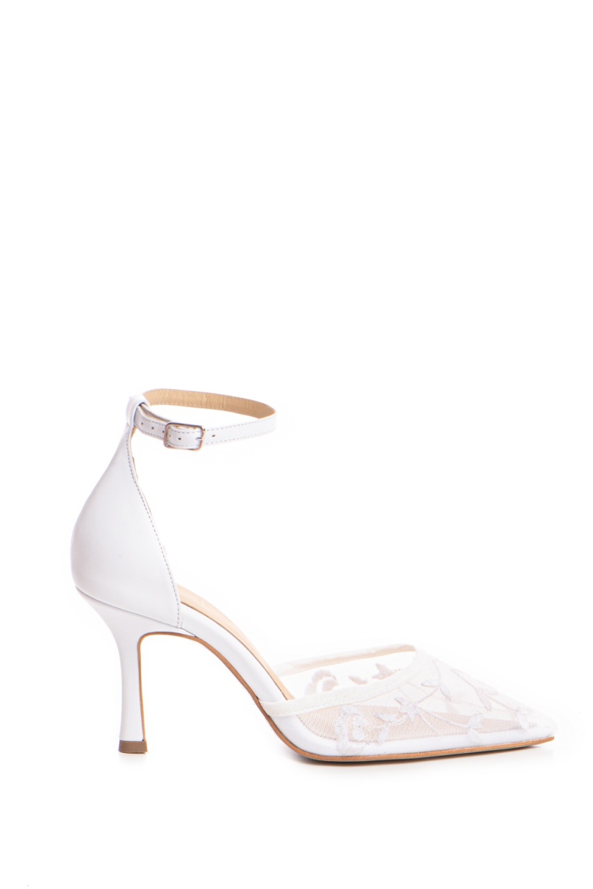 Pantofi Miralune piele naturala alba si toc mic evazat si dantela Chantilly