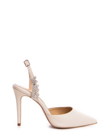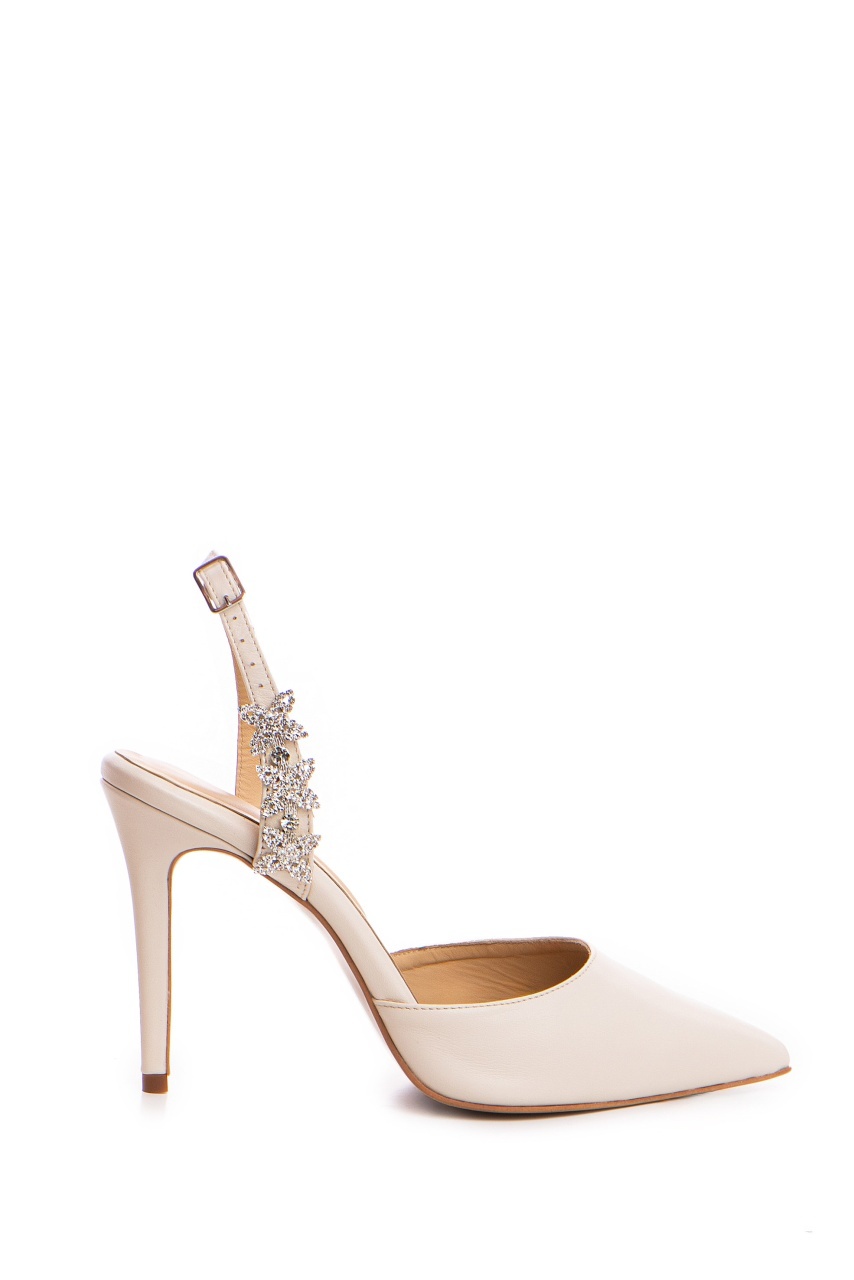 Pantofi Sylphie piele naturala ivoire cu toc subtire si accesoriu cristale